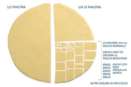 Varnishes are erected from plates called "pizzas", which are 10 mm thick with a diameter of about 25/30 cm. The weight of a plate varies from about 1,800 kg to 2,200 kg.